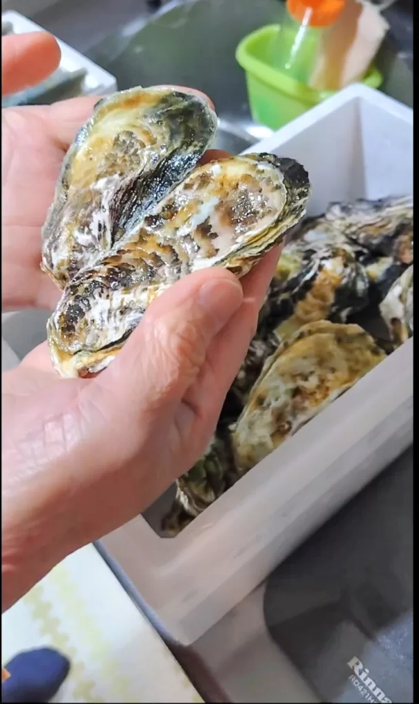 『殻付きって、初めてやし、どうしてたべるのん?』、『焼きガキにしたら、殻と汁が飛んで、大変やわ』と、よく言われまして、殻付きを避け、“むき身”を選ばれる方が多いです。が、