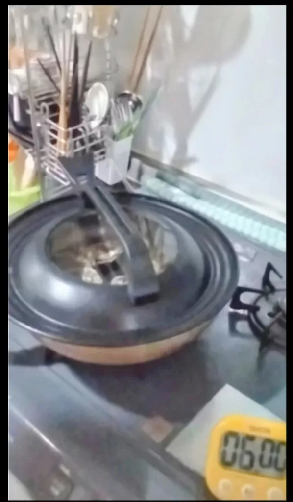 水を50㏄程度入れて、ふたをして、強火から中火で6分 さあ、蒸すぞ