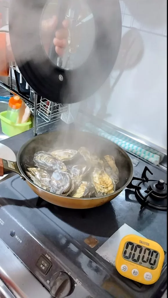 フライパンにカキのふくれた方を下に(美味しい汁がこぼれないように)、敷き詰めていきます。
